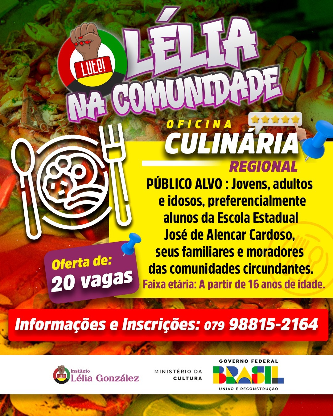 O Instituto Lélia González informa que estão abertas as inscrições para a Oficina de Culinária Regional, iniciativa do projeto Lélia na Comunidade. As atividades serão realizadas no Colégio Estadual José de Alencar Cardoso, situado no bairro Bugio.